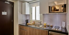 Kitchenette – Kitchen sink, electric stove with ventilation, microwave, minibar and freezer, Nespresso machine with complimentary capsules, tea and coffee tray, kettle and a complete set of kitchen utensils