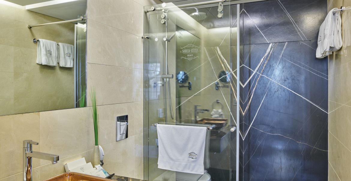 Toilet – Marble flooring, marble shower, hairdryer, towels, bathrobe and a complete set of amenities
