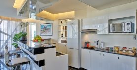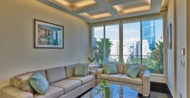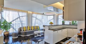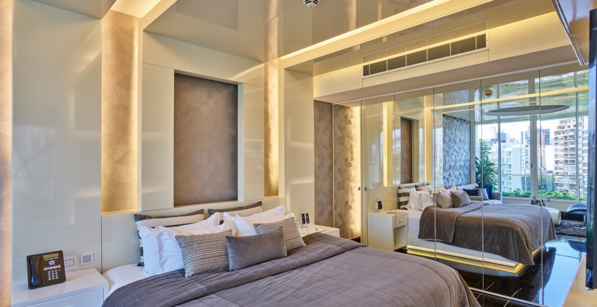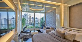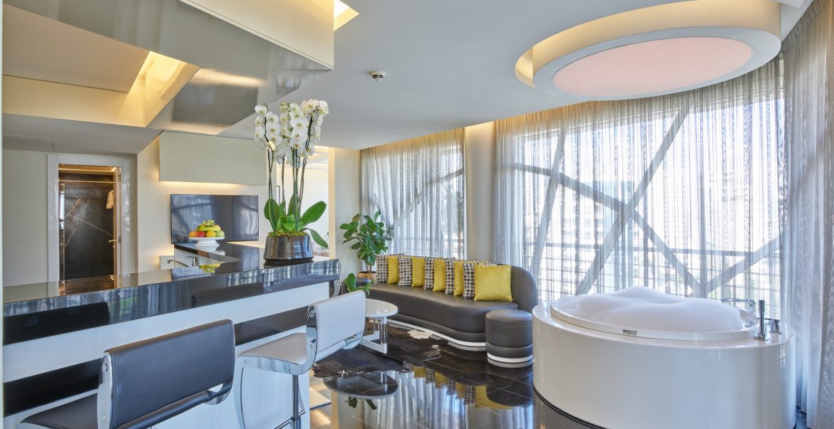 Renowned for its extravagant designs, the Sodeco Suite earns its name as the masterpiece of the hotel with its modern and minimalist interior. The Sodeco Suite features elegant black marble flooring and scenic panoramic windows overlooking the city of Beirut and allowing guests to relish a luxurious lifestyle from the 11th floor. Partitioned into several spaces, the suite seamlessly combines a salon, living room, bedroom, kitchen and toilet creating a spacious and convenient getaway. The salon integrates a lounge area with a jacuzzi, bar and kitchen allowing guests to enjoy a futuristic experience all while maintaining the suite’s homelike atmosphere. The bedroom is equipped with mesmerizing large windows, reflective mirrors and a comfortable king-sized bed enhanced with a plush mattress topper.