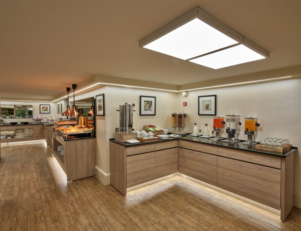 The Breakfast Buffet is available for guest use daily from 7:00 am to 11:00 am on the Mezzanine Floor. A large variety of stations are available including the beverage, cereal, bakery, cold cuts, cheese, hot display, fruits and crepe station.