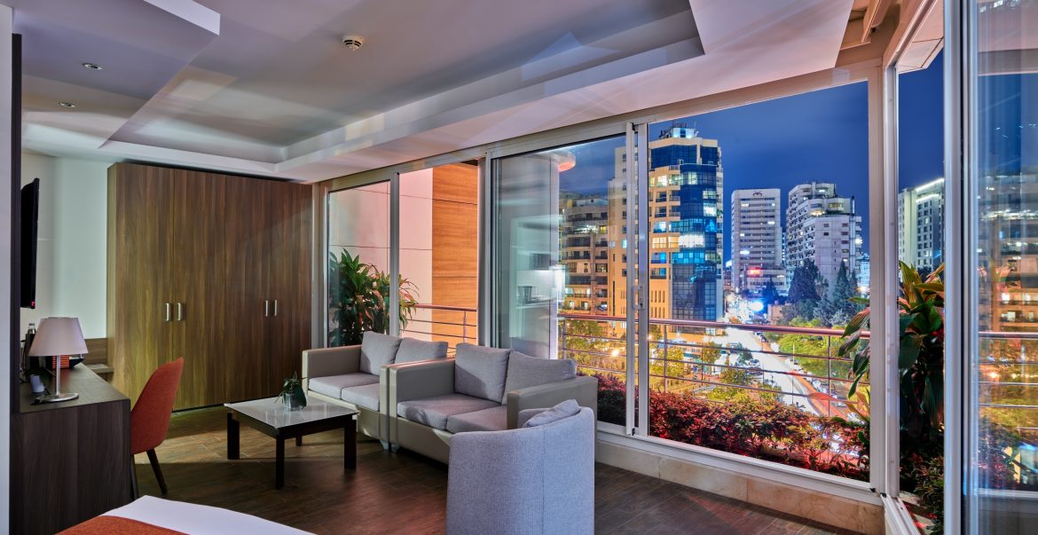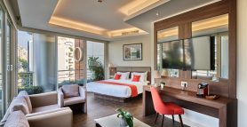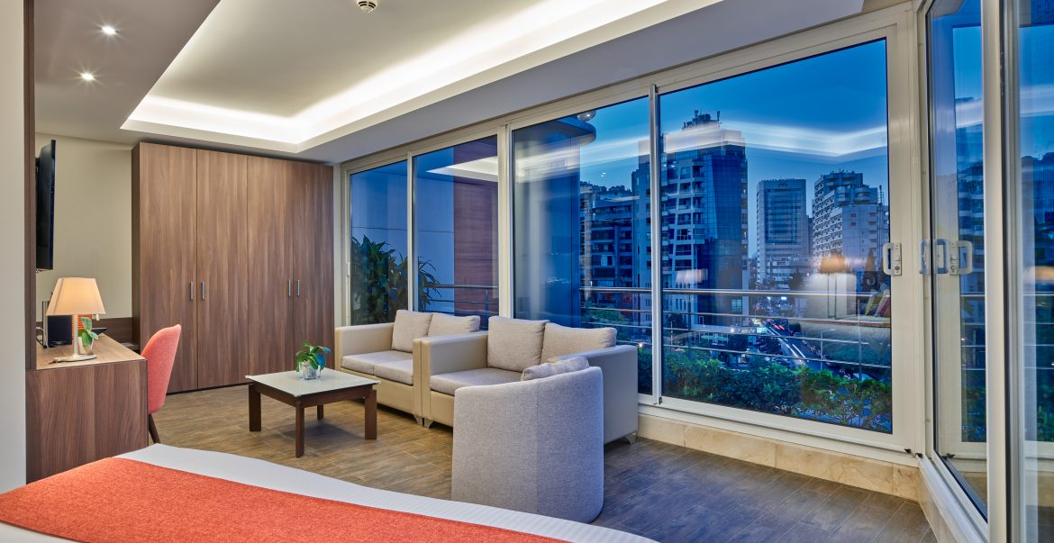 Suite Features – Lounge with large sofas and a table, desk, safe box, 50-inch LED Smart TV with satellite channels, telephone, luggage rack, roller shutters, air conditioning and heating system