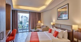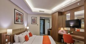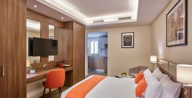 Room Features – A pair of single sofas with a table, desk, safe box, 40-inch LED Smart TV with satellite channels, telephone, luggage rack, roller shutters, air conditioning and heating system