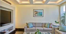 Bedroom – Sofa and lounge chair with table, mirrored closets, 55-inch LED Smart TV with satellite channels, safe box, telephone, iron and iron board, roller shutters, air conditioning and heating system