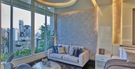 Renowned for its extravagant designs, the Sodeco Suite earns its name as the masterpiece of the hotel with its modern and minimalist interior. The Sodeco Suite features elegant black marble flooring and scenic panoramic windows overlooking the city of Beirut and allowing guests to relish a luxurious lifestyle from the 11th floor. Partitioned into several spaces, the suite seamlessly combines a salon, living room, bedroom, kitchen and toilet creating a spacious and convenient getaway. The salon integrates a lounge area with a jacuzzi, bar and kitchen allowing guests to enjoy a futuristic experience all while maintaining the suite’s homelike atmosphere. The bedroom is equipped with mesmerizing large windows, reflective mirrors and a comfortable king-sized bed enhanced with a plush mattress topper.